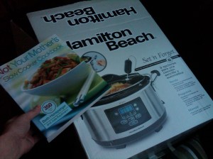 This realization came to me earlier today. I have had an incredibly crappy week at work and I got home to find a HUGE box from Amazon.com and a smaller one on top of it. What do you know, it is the crock pot I have really been wanting and a slow cooker cookbook to go with it! There was a note inside wishing me a happy early birthday from my mom. If there is anything I love more than getting bday presents, its an EARLY bday present. Thanks to my Amazon.com wishlist my mom got me the PERFECT crock pot. I went from feeling depressed, exhausted, and about to get in bed for the night at 6 p.m. to feeling elated and full of energy. Funny how that works. Tiredness really is a state of mind, and can easily change. I should work on trying to get out of the tired funk without having to receive presents 🙂