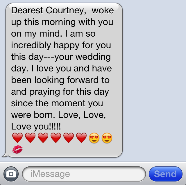 I was so grateful when 7am hit and I could get out of bed and get the day going! There is nothing like your wedding day to make you feel the love from pretty much everyone who knows you! I woke up to emails, texts, and facebook posts wishing me a happy wedding day and they were so appreciated. They were little reminders to not be nervous about anything; everyone was there because they loved Isaac and I and wanted to celebrate us. The waterworks were in full gear on Saturday morning. Especially after getting texts like this from my dad: