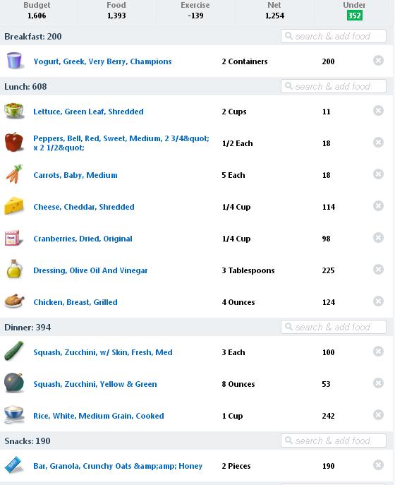 Ummmm, I don’t see any room for ice cream sandwiches, soda, or half of a large pizza. Do you? I feel like I have barely eaten today, yet I’m just about at my calorie limit. I ate “dinner” at 4:00pm so if I want a real meal before bed, I’m going to have to go run a few miles first. I think I’ll just eat a bag of veggies and call it a night!