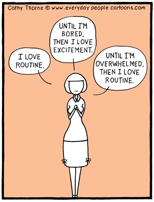 I found your cartoon about the INFP so me I burst out laughing. I love structure until I am bored and need the excitement back in my life. After awhile, structure makes me feel like I am in a small box which I cannot stand, but after awhile of being all over the place I need the structure to put everything back in order. Everything becomes chaotic in my brain and I get overwhelmed and structure puts me back together again, well, until the structure makes me feel like a robot. Funny thing is, my partner hates my lack of structure. Actually, he loathes it and can not understand why I keep going back and fourth. While I understand his structure but find it utterly boring and predictable. lol
