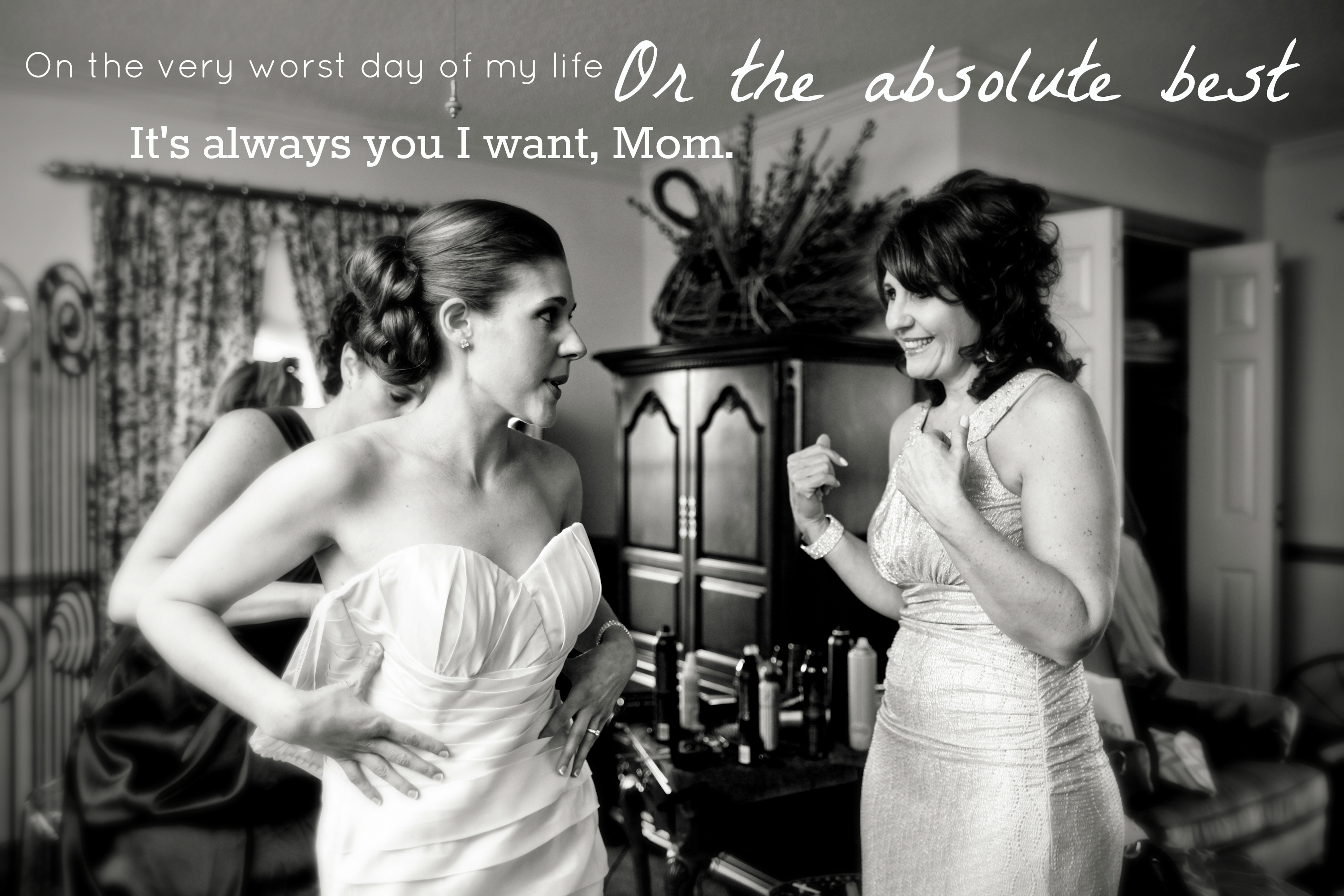 There was a photo taken at my wedding a few months ago (remember that big, insanely expensive party?) that I think sums up the kind of mom you are. It was a candid photo, I don’t think either of us knew the photographer was snapping away. I was getting my hair done and you were standing in the background keeping an eye on things and beaming with pride.