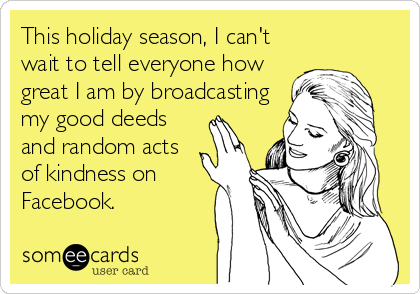 This holiday season, remember that good deeds and random acts of kindness don’t count unless you post about them on Facebook, Twitter, Instagram, and every other social media outlet you belong to. I was so thankful when November finally ended because I’m not sure how much longer I could handle reading Facebook statuses like “Day 20: I’m thankful that I studied hard in college and graduated with honors because now I’m working at my dream job and can afford to do anything I want, including traveling to Bora Bora this summer! #Godisgood #blessed #thankful.”