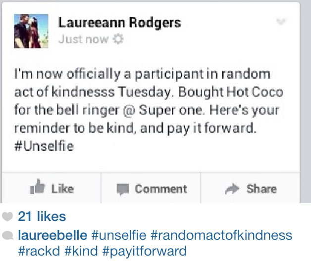 On Instagram, there are thousands of people documenting their random acts of kindness with hipster filters and witty hashtags. I searched the tag #randomactofkindness and was not disappointed by the results: