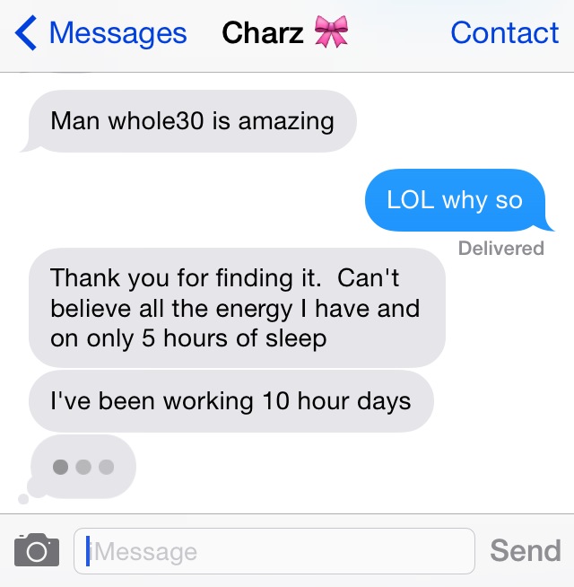 • About 3 weeks into Whole30, I started waking up without an alarm and feeling refreshed and ready to go. This is a complete change for me. Normally I lay in bed until the last possible second, and then rush to get ready for work, grumbling all the way. I’d skip breakfast (no time for that) and be starving by 11am, so I’d eat a frozen meal at work. Now, I wake up, make my bed, get ready, clean my bathroom, make a delicious breakfast, take care of the dog, get our lunches ready to go (they have already been prepped for the week so it’s quick), get online for a few minutes, catch up on some of my TV shows, and head to work by 8am. WHO IS THIS GIRL!?
