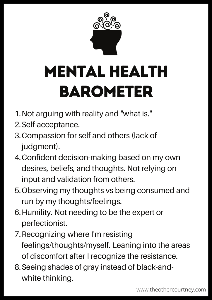 A few months ago I wrote down my mental wellness barometer. I have since used it to not only gauge where I am on random days, but also as a way to work through stressors. I use each item on my list as a journal prompt. If I know I’m not meeting a specific item on my list as well as I’d like to, I know exactly where I need to start diving in and and exploring. It’s also helpful in allowing me to realize where I’m stuck. When I am feeling especially frustrated, depressed, or anxious, I read through my list and can quickly pinpoint which area of mental wellness is being affected by my current state.