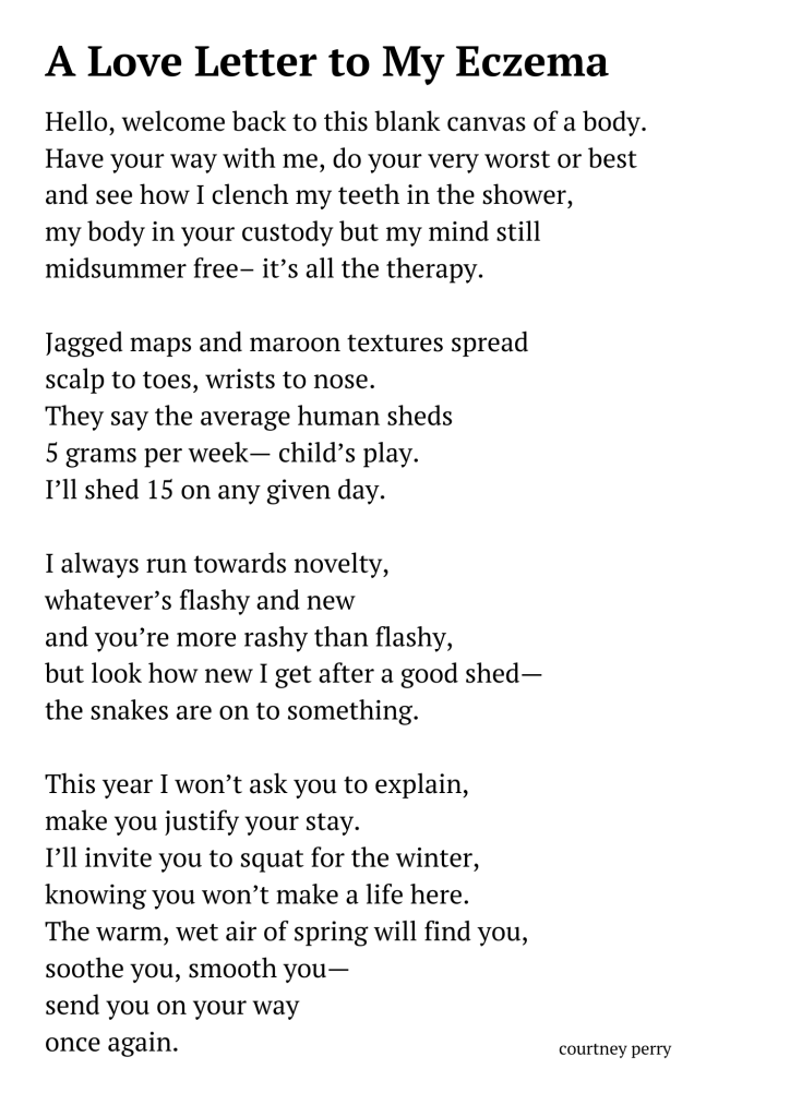 Today’s poem was inspired by finding an event in my calendar that apparently one year ago me decided to leave for future me. It was a heads up that the weather is probably changing which means my skin is probably pissed, or will be soon. It gave some love, reassurance, and reminders of how to help it, and that *it’s temporary*. It was such delight— reading this love note to myself that I wrote long ago and had no memory of doing.